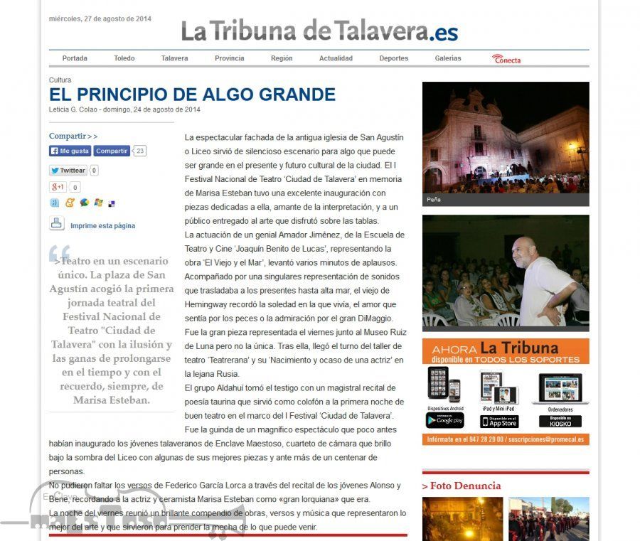 La espectacular fachada de la antigua iglesia de San Agustín o Liceo sirvió de silencioso escenario para algo que puede ser grande en el presente y futuro cultural de la ciudad. El I Festival Nacional de Teatro ‘Ciudad de Talavera’ en memoria de Marisa Esteban tuvo una excelente inauguración con piezas dedicadas a ella, amante de la interpretación, y a un público entregado al arte que disfrutó sobre las tablas.